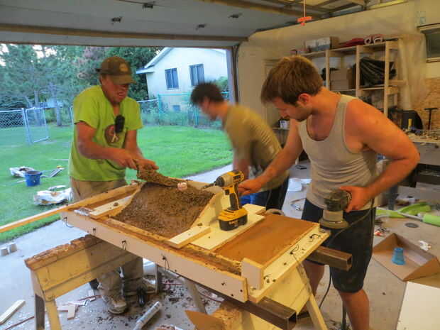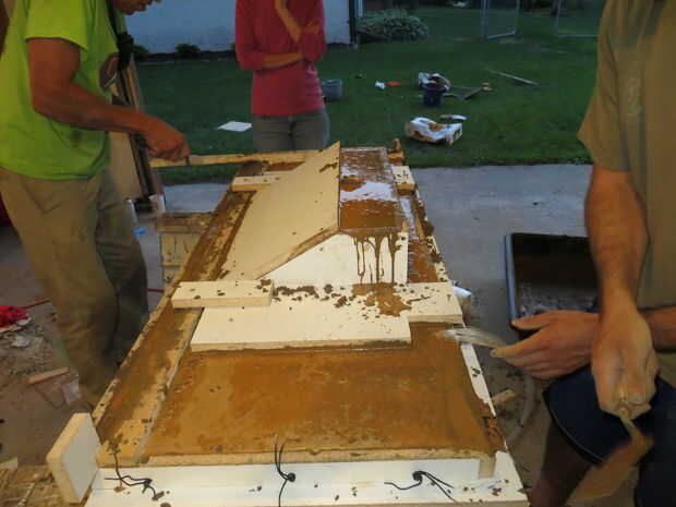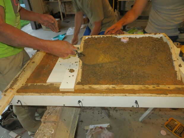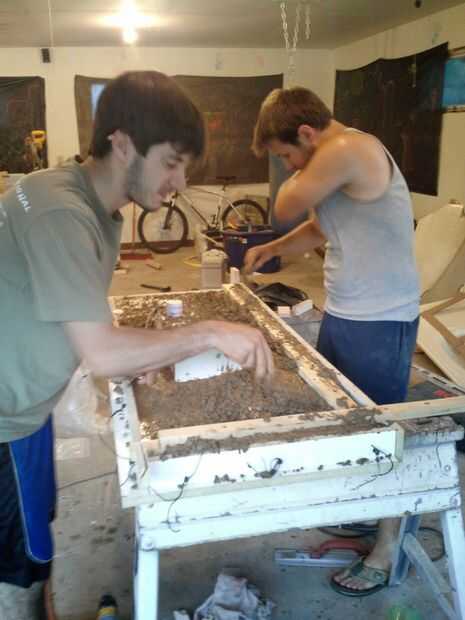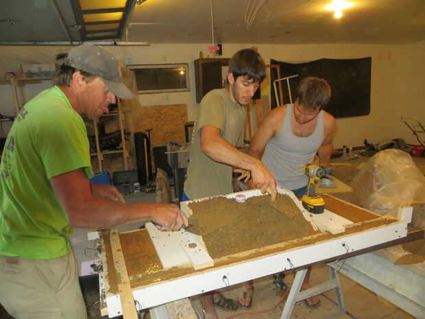 Coloque con cuidado el hormigón alrededor de las fibras que se pegan a las piezas de vidrio. Coloqué el hormigón con una llana pequeña. Alistaron la ayuda de algunos amigos para asegurarse de que pude para obtener el hormigón lleno abajo alrededor del vidrio y fibras teniendo cuidado de no tirar flojo.