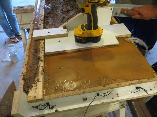 Mezclar el hormigón según las indicaciones. Usé el color líquido para lograr el tono que quería. Me aseguré de hacer un montón de pruebas para encontrar la relación correcta de agua, color y cemento. Anote esta información para que usted puede duplicar en todos los lotes y más tarde para la mezcla. Para lotes más grandes, usted necesitará mezclar con un mezclador de concreto. Ya que sólo necesitaba dos bolsas que mezclé el hormigón en una tina de mezcla con una pala.