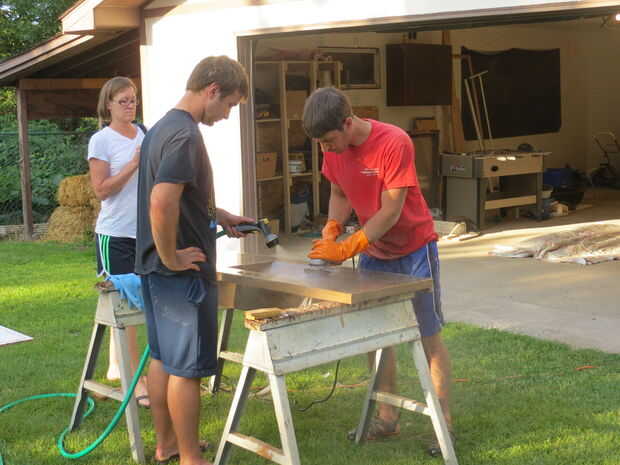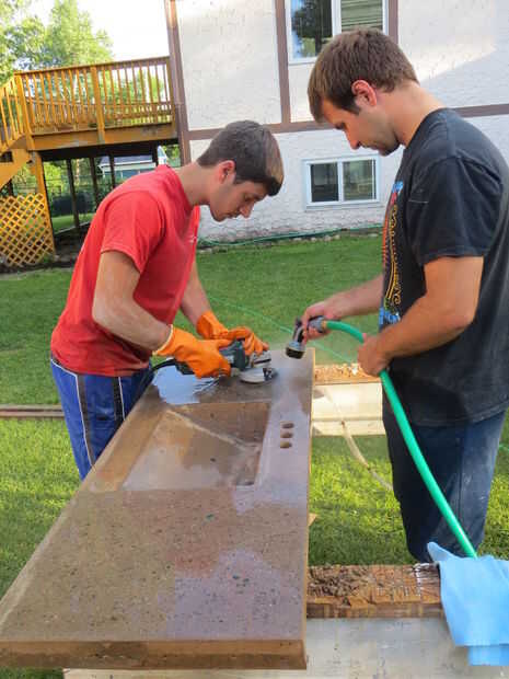 Usando el cociente del color que usted escribió anteriormente puede mezclar una mezcla de hormigón sin el agregado o sólo cemento con acrílico. Esto frote sobre la superficie y asegurarse de que usted está usando guantes. Una vez se seca en sobre una casa puede empezar a pulir la superficie. Comencé con grano 50 y trabajó hasta 400 grit. La mayoría de selladores decirle que deje en grano 200 pero la que estaba usando que se recomienda entre 400 y 800. Asegúrese de consultar el sellador a que usas antes que pulir todo el diente de la superficie para el sellador fijar! Asegúrese de llevar todo su equipo de seguridad como guantes, gafas y tapones para los oídos mientras que pule como que no estaba tan mal en estas fotos. Te aseguro que empecé justo después de que fueron tomadas.