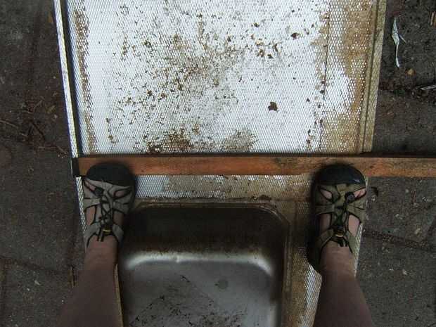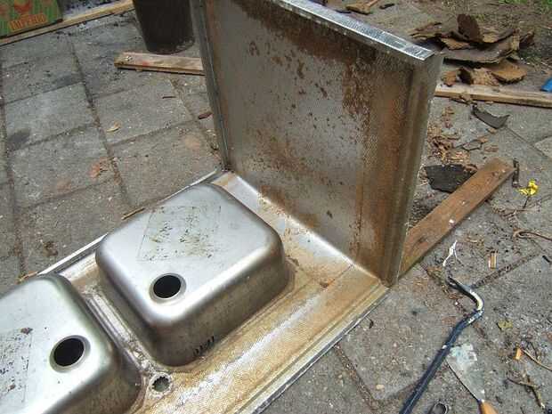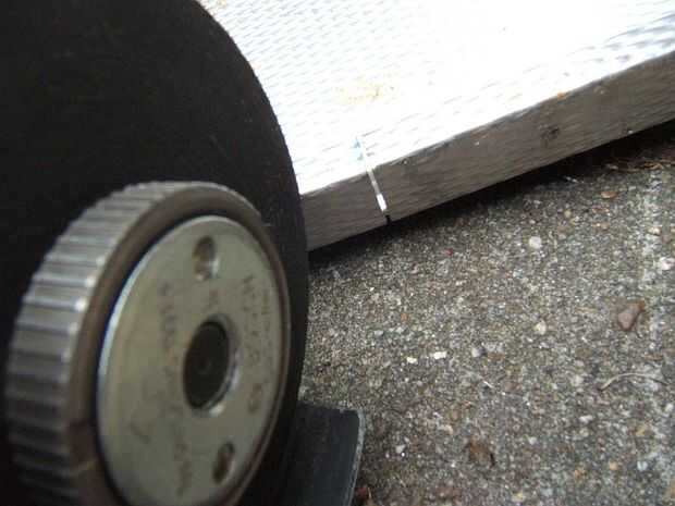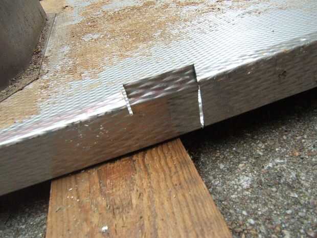 Saque su amoladora de ángulo (o una sierra) y corte los bordes plegados a cada lado, para que la cubierta se pliega fácilmente. Permiten el metal a ambos lados del corte se superponen (ver tercera imagen).