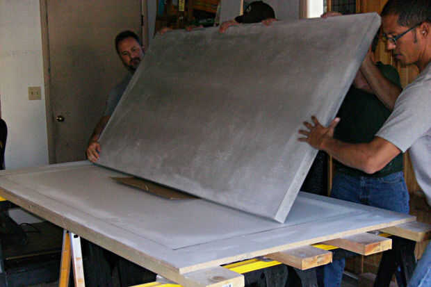 7-10 días de curación, tiene que la cara de la cubierta hacia arriba para que puedas acabarlo (y en nuestro caso, hacer cualquier trabajo de parche necesario). Una vez más, nuestro top terminado pesaba alrededor de 400 libras, así que necesitábamos cuatro chicos para hacer esto. Colocar un cartón contra un lado y con punta de la cubierta en su lado en la cartulina. Esto nos permitió deslizar hacia el otro lado y luego baje suavemente hacia abajo, ahora descansando arriba.