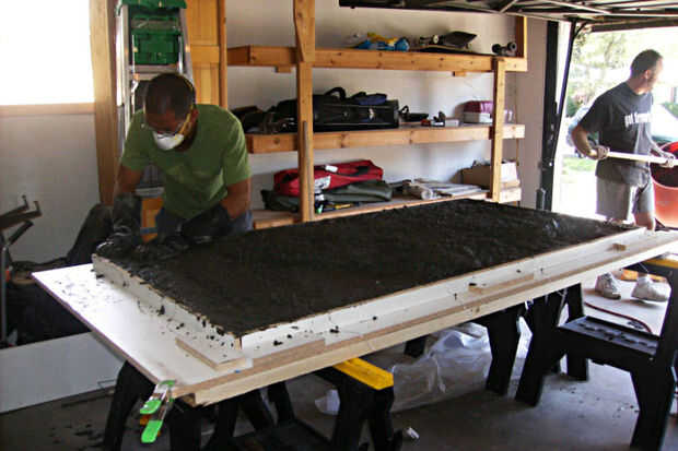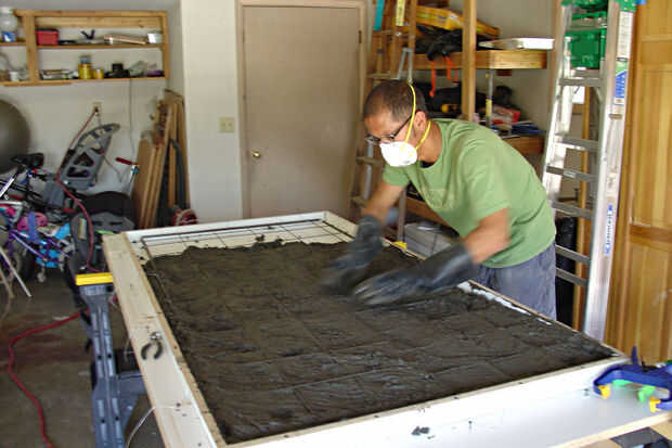 Usted definitivamente quiere al menos dos personas al verter. Uno trabaja con el mezclador y palas el concreto en el formulario mientras que la otra (s) usan las manos para empujar en su lugar. Asegúrese de que usted no empuje demasiado fuerte sobre la rejilla de soporte. Que quieres sacar de debajo para asegurarse de que es compatible el remesh.