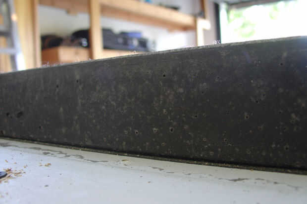 También puede utilizar una lijadora de Palma sin papel de lija a la forma de vibrar, o incluso una máquina de vibración grande enganchado a la forma. El más largo y más uniforme la forma se hace vibrar, mejor resultará. Nuestra tapa bastante bien fue vibrada (aparte de las 3 grietas), pero los lados se podrían haber hecho un poco más. Simplemente no hay que subestimar la importancia de este paso. Es probablemente el más importante cuando se trata de obtener un acabado liso sin huecos. También, menos huecos significa menos potencial de agrietamiento.