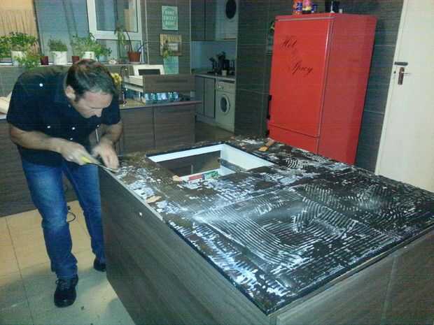 Primero limpié la superficie vieja, era baldosa lo que había que quitar el pegamento con un cincel de madera.