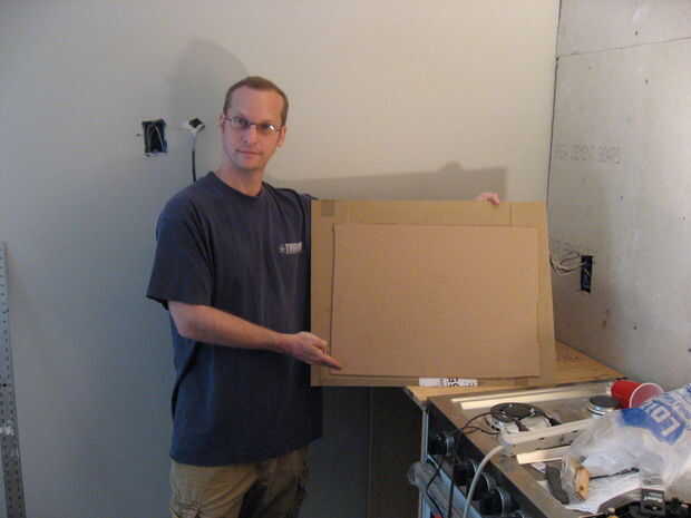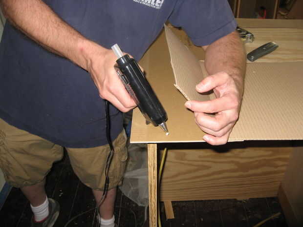 Cheng usa doorskin para sus plantillas, pero tenía un montón de cajas de cartón que queda de mis armarios IKEA, así que reciclé en plantillas. Me aseguré con la fábrica de cortar los bordes de la cartulina alrededor de los perímetros y dentro de la abertura del fregadero para asegurarse de que estaba todo perfecto. Una pistola de pegamento funciona muy bien para armar la plantilla. Mientras que forma las plantillas, permitió un excedente de 1 1/2" de la superficie del gabinete gabinete y una proyección de 1/8" alrededor de la abertura del fregadero.