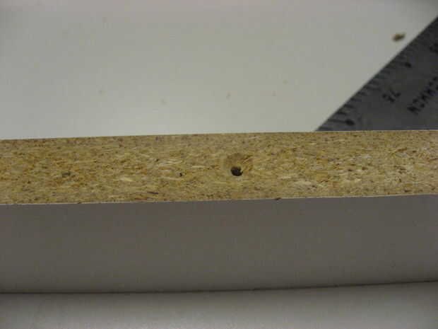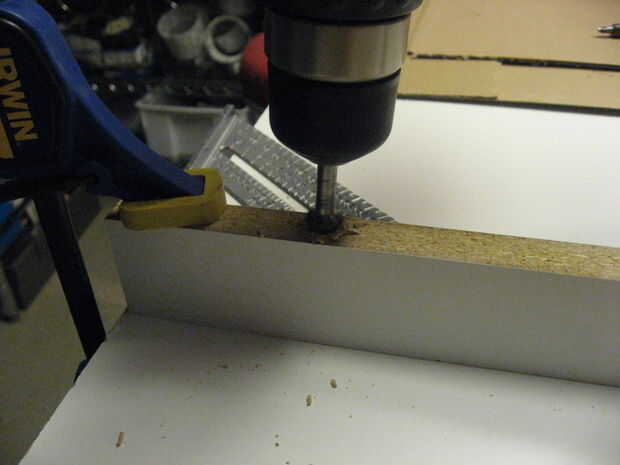 Montados a los lados del molde por pretaladrar los agujeros cada 3 pulgadas o así, entonces utiliza un poco de avellanado para nuestros tornillos al ras con la parte superior. La parte superior del molde debe ser perfectamente al ras de modo que usted podrá para subbase el hormigón durante el vertido. Tornillos son fáciles de usar, pero tenga cuidado de perforación. Si usted les taladro demasiado, se fractura la melamina y arruinar esa pieza del lado. Esto es especialmente así cuando taladra muy cerca hasta el final de la pieza. Reforzamos las esquinas con los bloques de la melamina de chatarra ya que estarían bajo mucha presión.