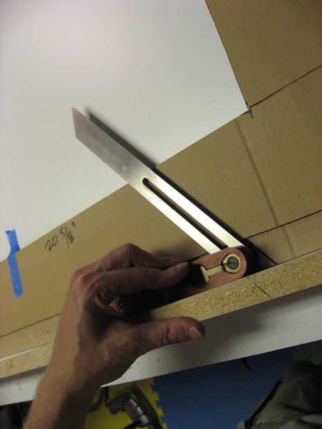 En lugar de tener una costura siga recto por el centro de la cubierta que quería hacerlo en un ángulo y destacar con una tira de aluminio. De esa manera podía referirse a él como un "elemento decorativo" en lugar de una "fractura de estrés". Compré un 1/8 "x 2" x 12' tira de aluminio en Lowe ' s de, apoyar hasta en el molde para decidir lo que sería bueno y entonces lo marcado en los costados y la plantilla. Luego se utilizó a una guía de ángulo para transferir los ángulos apropiados a la sierra, donde los lados y del recorte del fregadero se corte y luego atornillados en el molde con un espacio de 1/8" para permitir que la tira de aluminio se deslice en el molde.