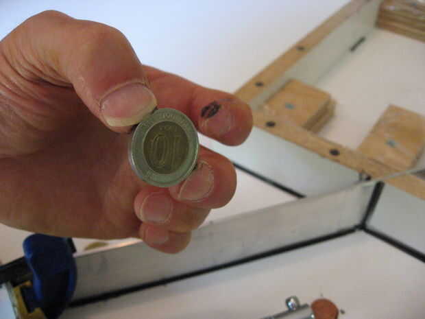 Ahora que tenía la jaula soporte hecha, lo levanté para preparación final. Para empezar, he aspirado el molde y limpiar bien con alcohol isopropílico. Para agregar más personalización para las encimeras quería incrustar monedas de los lugares que mi esposa y yo habíamos viajado a. Esto se logra fácilmente frotando un poco de masilla en el lado de la moneda que quería expuesta y disponiéndolas cara abajo en el molde. La masilla da suficiente adherencia para mantener la moneda en el lugar durante el vertido y no tengo que esperar para que se seque.