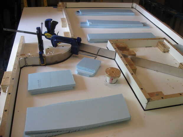 Los próximos pasos a vuelva a colocar a los espaciadores de espuma de poliestireno en el molde, colocar la jaula y luego atan alambre para apoyar la jaula una vez que los espaciadores fueron quitados. Le puse tornillos alrededor de los bordes fuera del molde para poder atar el alambre alrededor de las cabezas y después envolver el borde de la jaula. Una vez que todo estaba atado apagado, me deslicé a los espaciadores hacia fuera por debajo de la jaula que estaba suspendido desde el fondo del molde.