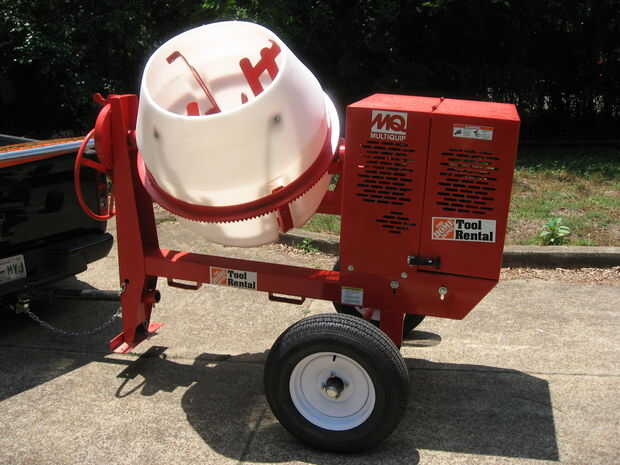 Finalmente había llegado el día del vertido y para colmo, nuestro barrio Home Depot había alquilado nos una hormigonera hermosa, nueva, Virgen por 50 dólares para el día. Así es, éramos los primeros en usar esta máquina fina y Sr. P estaba ansiosamente esperando para poner a prueba.