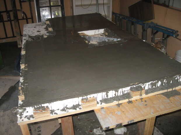 Debe vibrar el concreto para evitar burbujas de aire que crean huecos en la cubierta. Hay vibradores de concreto comerciales, pero encontré que rapear mazos de caucho a lo largo de la parte inferior y en todo el molde parece trabajar mejor. Realmente lleva usando los mazos, pero pronto verás las burbujas de aire hace estallar hacia fuera a lo largo de la superficie por lo que sabrás está trabajando. Cheng también recomienda el uso de una lijadora orbital con ningún papel de lija en ella para vibrar el hormigón. He intentado esto y funcionó ok alrededor de los lados del molde, pero no mucho a lo largo de la parte inferior.