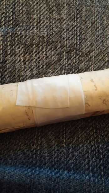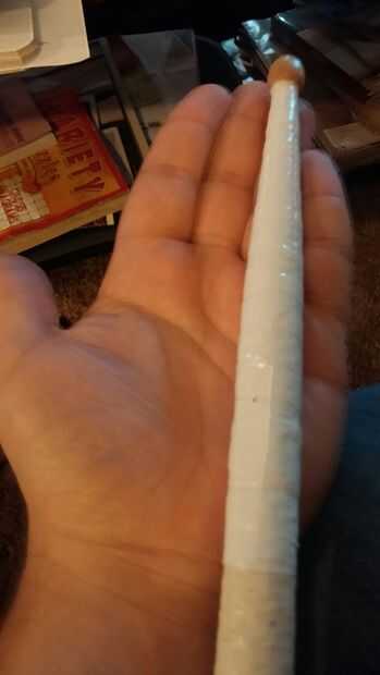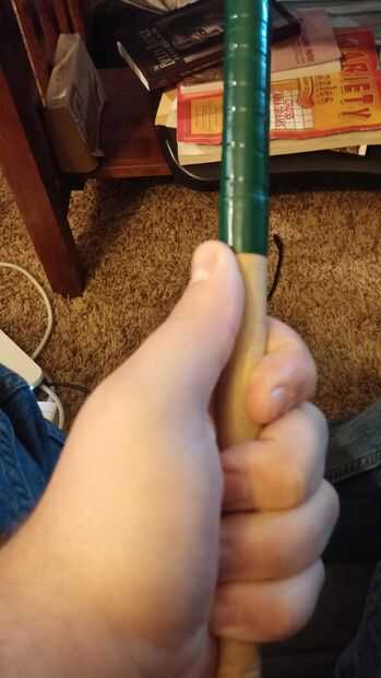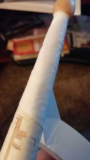 A continuación, usted está listo para el palo de la cinta. Empezar por hacer una banda sólida cerca de la punta, entonces el espiral hacia abajo. Me gusta mantener el palo en mi mano izquierda con la base descansando sobre mi cinturón y la cinta en mi mano izquierda donde puede girar libremente.