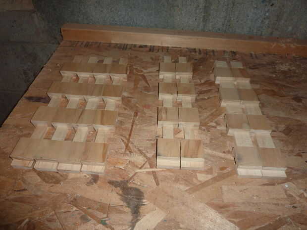 7.) prueba de encajar las piezas tanto como sea posibles. Asegúrese de que las diferencias entre plazas son 1.5" aparte con una tira de desecho de madera y compruebe que las piezas encajan bien tan pronto como usted llegar lejos. Puede ser necesario afeitar apagado un adicional 1/16" de las dimensiones para hacer las piezas encajan fácilmente.