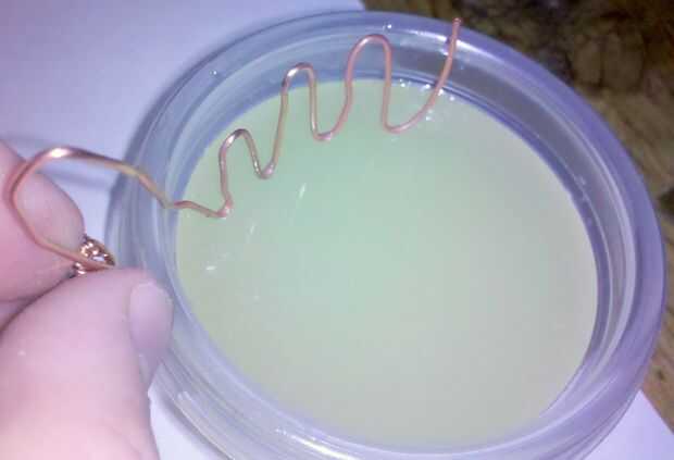 después de unos minutos te darás cuenta que la solución empieza a verde azulado, y en este punto se puede decir que el elemento metal se cubrirá en una fina capa de cobre. Si su tipo de tomar ennegrecido hacia fuera y frota la lana de acero para quitar el óxido y luego sujétela respaldar y poner de nuevo en la solución.