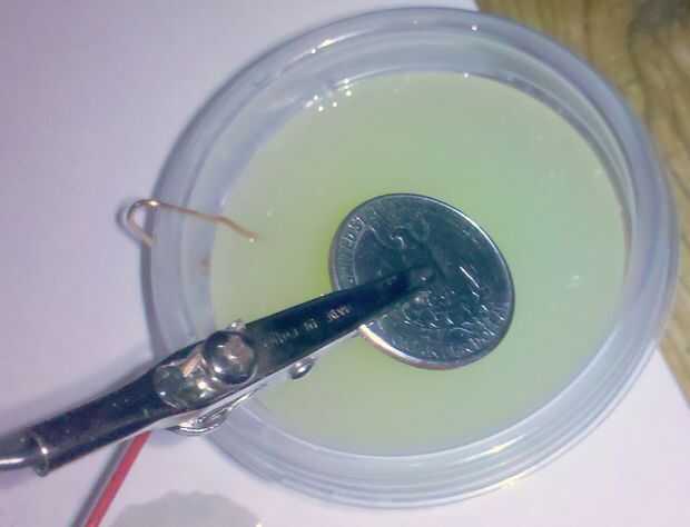 Doble hacia arriba el alambre de cobre que está conectado al terminal positivo por lo que puede ser totalmente sumergido en el jugo de limón, pero asegúrese de dejar suficiente espacio para el elemento que está chapado y la pinza.