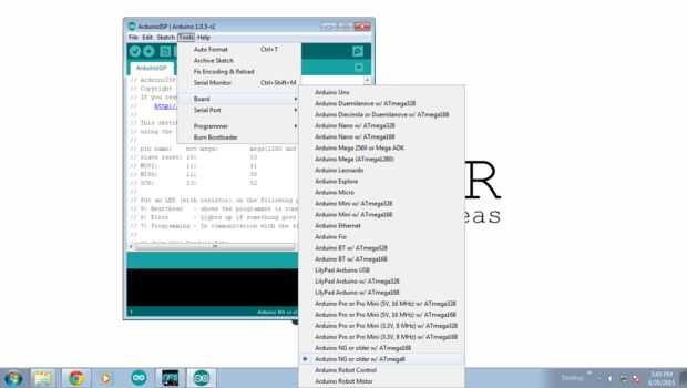 Seleccione la Herramientas >> Junta y select correspondiente junta en la que desea grabar el bootloader, estoy usando atmega8 como microcontrolador de destino por lo que voy a elegir tablero Arduino NG o mayores con Atmega8