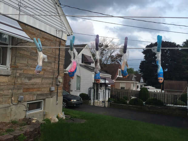 Utilizando pinzas, coloque las cabezas de la muñeca a un tendedero por su pelo. Las cabezas de los mismos deben ser flotante y suficientemente lejos aparte de uno con el otro que puedes grafitear cada cabeza individual.