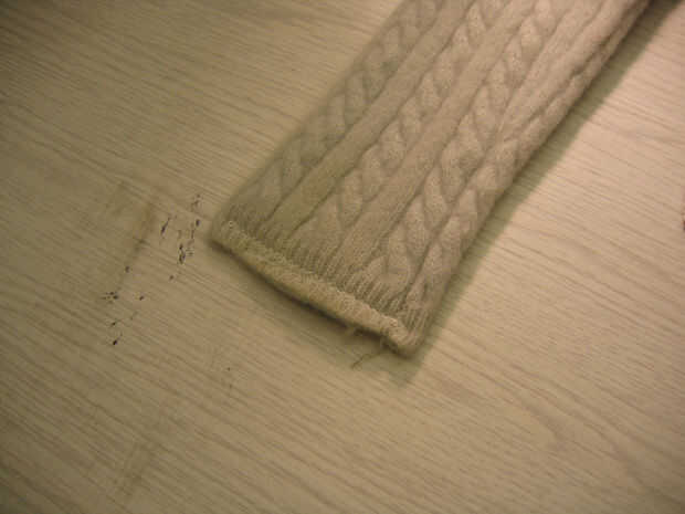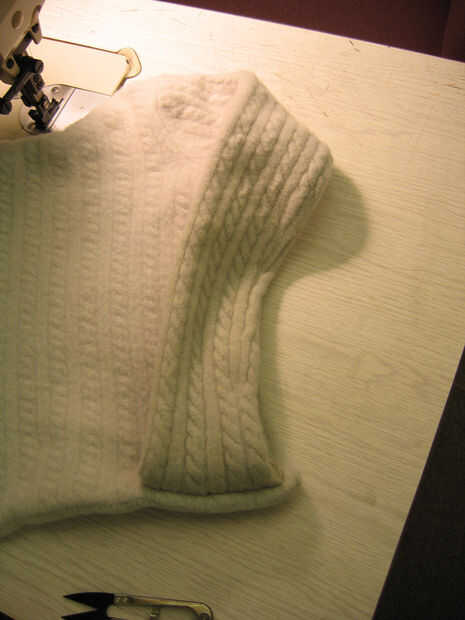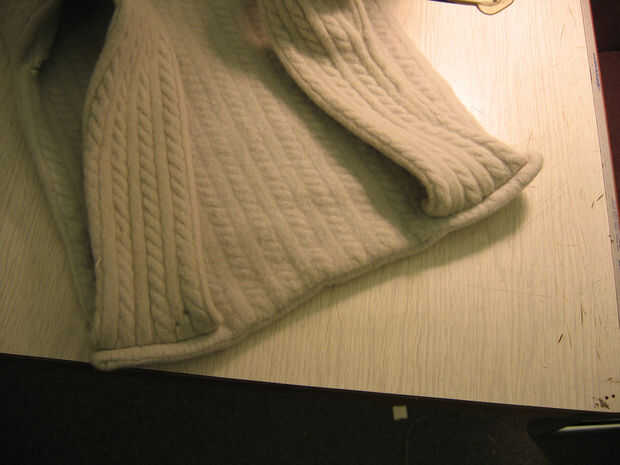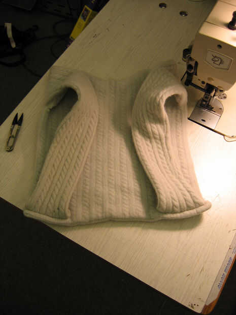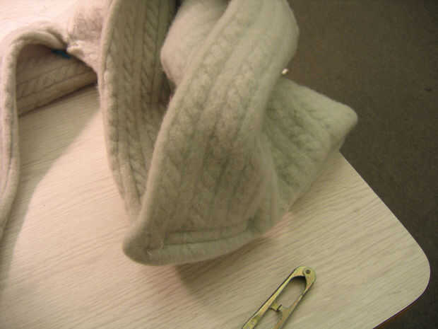 Doblar los brazos hasta la cintura. Está empezando a parecerse a una mochila, ahora. Por el tamaño del suéter que tenía, no era necesario para extender los brazos, pero si los bucles del brazo parecen especialmente pequeños, debe extenderse con un poco de correas de nylon o tela para un ajuste cómodo. En mi caso, simplemente cosí los extremos de las mangas a la parte inferior de la chompa.