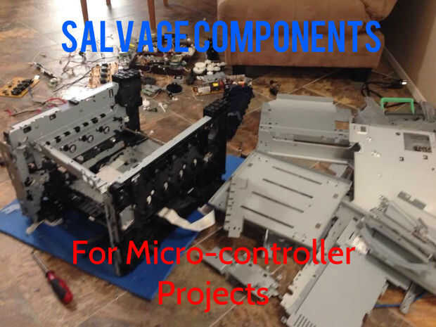 He comprobado que la mejor fuente (más económica y disponible) para los componentes es impresoras de chatarra. Las impresoras tienen pantallas LCD, motores paso a paso, motores DC, sensores de MOSFETS, interruptores, temperatura y humedad, servos, solenoides, alambre eléctrico, láser, espejos, sensores de luz, LED, engranajes, resortes, ruedas, tornillos, imanes y un montón de otros componentes útiles para empezar a experimentar con micro controladores.