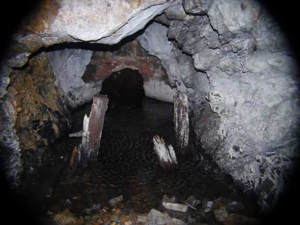 Sesenta pies de la boca del túnel es un eje de aire, y justo en frente están los restos de un tabique de ladrillo, ahora roto a través, usados antes para embalsar agua. El agua es tomado de la boca del túnel a través de un canal de madera y tubos de hierro en un tanque de 12 pies de diámetro por 10 pies de alto."
