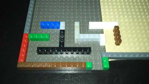 Empieza clavando tiras largas todo alrededor de la base cerrando todos los bordes excepto una puerta con un grosor de dos pinchos de Lego.