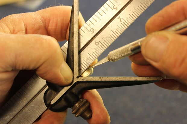 El método clásico de encontrar el centro de un objeto redondo es usar una cabeza del buscador centro unida a una regla de metal estándar, tales como utilizada en una combinación de cuadrados. Mantenga el punto redondo en la muesca en V y marque una línea muy fina. Esa línea es un diámetro del círculo. Gire la pieza y marque otra línea. Donde las dos líneas se cruzan es el centro. Fácil y precisa para círculos grandes (digamos sobre 1" de diámetro), no es tan fácil para una varilla de 3/8". Olvídate de usar un lápiz; Utilice un cuchillo afilado como un cuchillo del Exacto. Incluso con un cuchillo afilado, la línea puede ser un poco excéntrico.