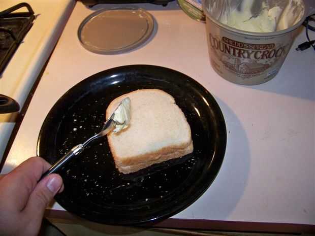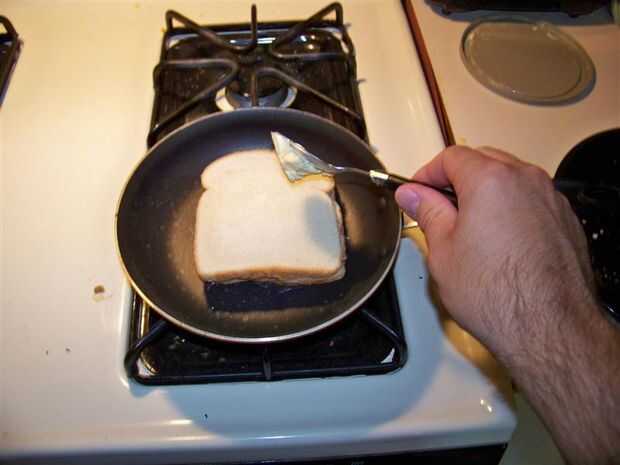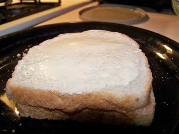 Gancho agarrador sandwich y lugar mantequilla hacia abajo en la sartén. ¿Oye buen chisporroteo? Desde aquí uno que es un desafío de tiempo. Trabajar rápido o el riesgo de quemar la comida. Volver a usar la cuchara tercera aplicar una fina capa de margarina a la pieza superior del pan.