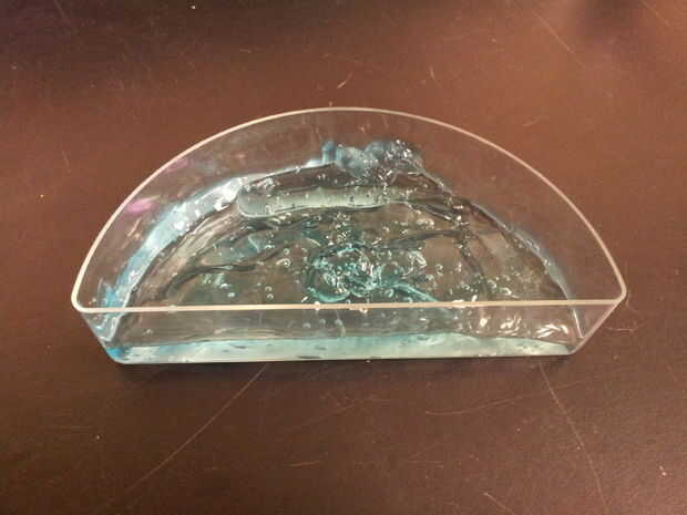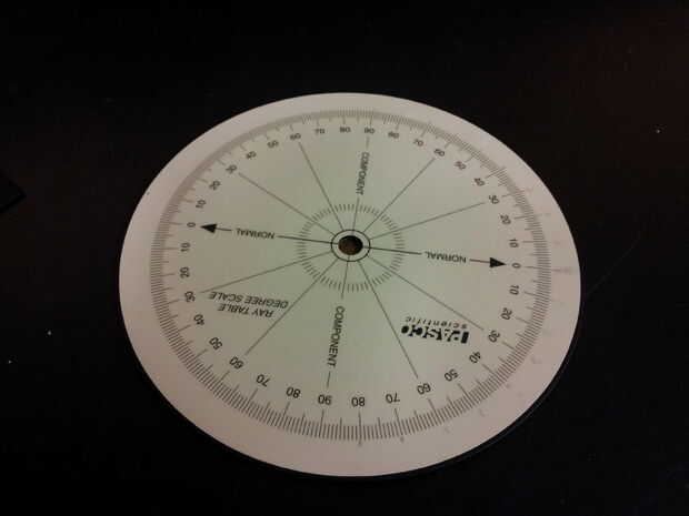 La razón por la que se utilizó una simple fuente de luz blanca es porque el gel de pelo en nuestro experimento fue la luz azul, que indica que la longitud de onda azul sería la única luz pase a través de nuestro medio y no tenemos acceso a la luz azul. Además, no era una sola línea recta, rayo, pero un rayo largo y estrecho para que pueda determinar con facilidad el ángulo de incidencia al mismo tiempo, la luz pasa a través del material. Un plato semicircular fue elegido como la forma de la nave para el gel de pelo debido a las propiedades ópticas que proporcionaría. En primer lugar, tenía una ventaja clara y recta que podría golpear el haz de luz, lo que es fácil de controlar el ángulo de incidencia. Entonces, después de pasar por el gel para el cabello, la luz sería salir siempre perpendicular la superficie del plástico, basado en las leyes de la geometría, que significa que la luz no refractarse al salir, lo que permite fácilmente medir el ángulo de refracción.