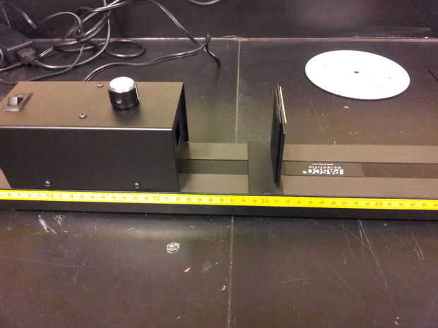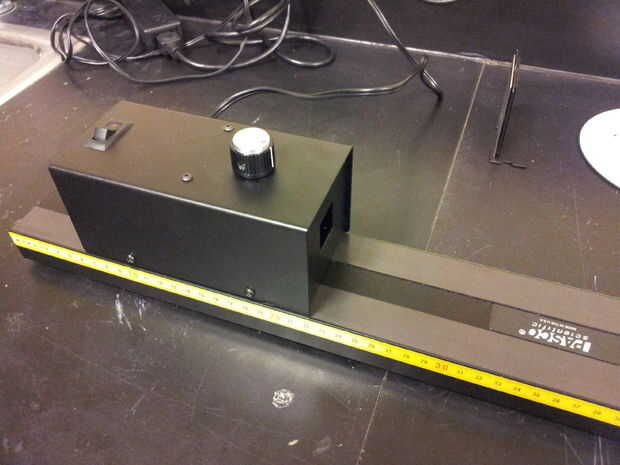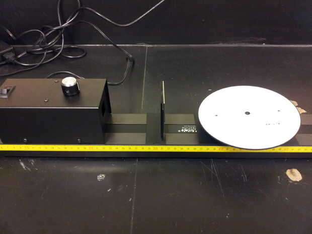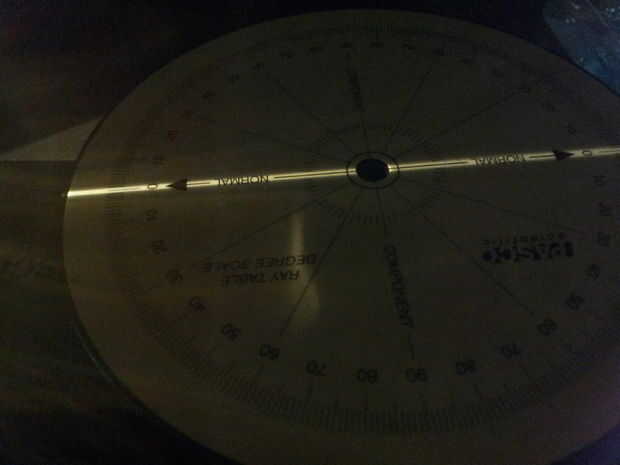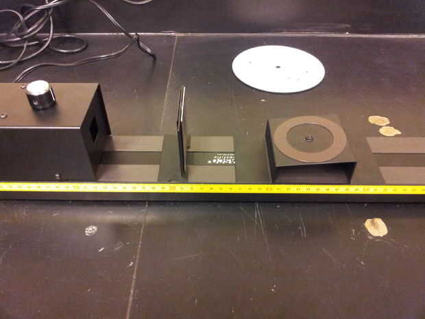 Configurar placa base larga y recta para ayudar a alinear todos los elementos y colocar la fuente de luz en un extremo de la plataforma. Luego coloque una superficie inclinada (base del transportador), que inclina hacia la fuente de luz. Coloque el transportador en la base del transportador y dejarlo ser asegurado en su lugar. Utilizar una placa de máscara y Raja raja u otras herramientas adecuadas para crear un único y vertical haz de luz que pasa directamente a través de la placa