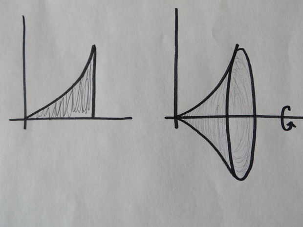 Sin embargo, para objetos más elaborados, puede no sólo encontrar el área de la base y multiplicar por la altura. Colocando el objeto a lo largo de un plano de coordenadas, puede utilizar integración, una técnica que hablaré más adelante, para encontrar el área de un segmento del objeto. Este método conducirá en cómo encontrar el volumen de un objeto.