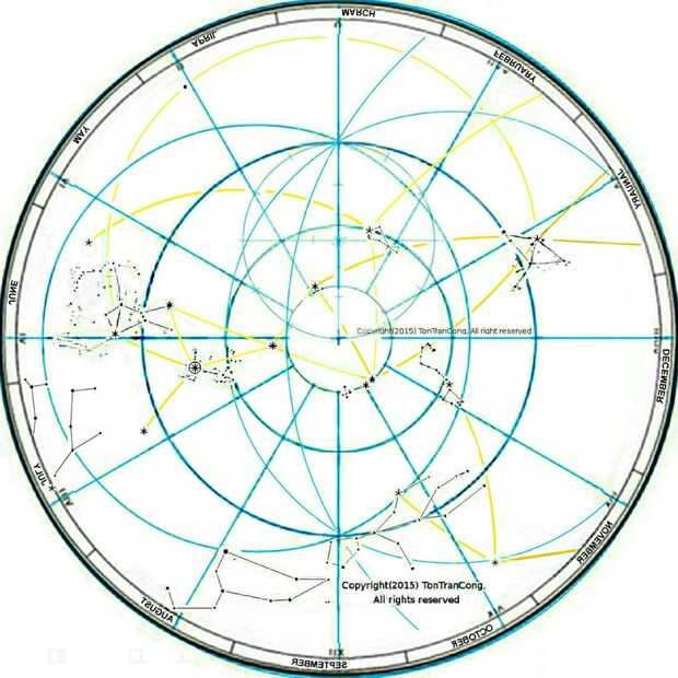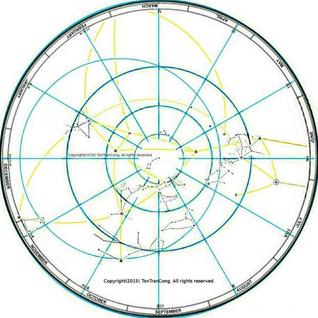 Seleccione una estrella brillante de una fecha en el año cerca de la fecha actual (o mes) y leer su declinación de cualquier fuente como internet, sus propias tablas o los dos mapas de la estrella suministrados aquí. Si utilizas los mapas de la estrella, su declinación se lee desde los círculos de declinación constante y la fecha desde el borde en el lado opuesto (que es también el punto más cercano al sol en el círculo elíptico).