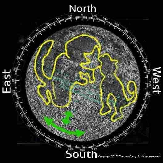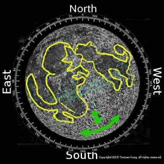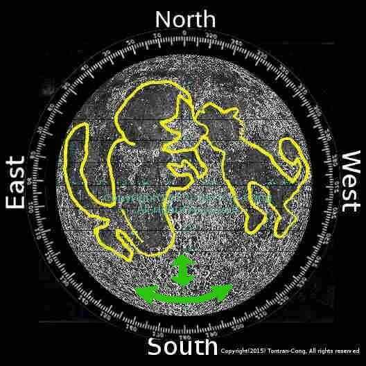 Considerar ese compás se levantó se levantó una vista por debajo de una brújula normal y se puede utilizar para encontrar direcciones cuando está alto en el cielo. (La parte principal de la luna, con una visualización de León, está a nuestro lado oeste y su final, con una visualización del mono, este). Sin embargo, el norte de la luna es el polo norte del eje de rotación Lunar y hace un ángulo con el eje de la tierra, el ángulo a veces alcanza 23.5 + 1.5 = 25 grados. Imagine que usted puede caminar sobre el plano ecuatorial celeste y el eje Lunar está plantado en él a un ángulo de 90-25 grados y vas alrededor de él una vez cada 27,3 días.