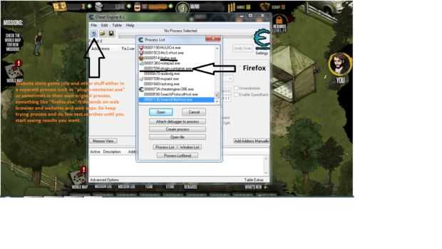 Comienzo CheatEngine. Haga clic en el icono del Monitor. Un "proceso lista se abrirá ventana." Seleccione el proceso Plugin Container.exe y abierto. (Si ves 1 entonces más de lo mismo proceso intente ambos o solo borrar todo historial/cache de Firefox y vuelva a intentar)