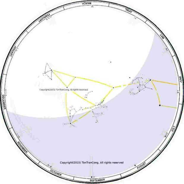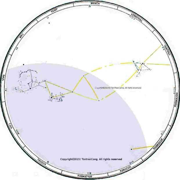 Cuando la constelación de Orión comienza a establecer en la dirección occidental de la Osa todo cerca de Polo Norte Celestial y Arcturus Boote y los dos indicadores (Centuri) sur cerca del polo sur celeste han aumentado durante 3 horas. El método continua con estas estrellas toman su turno.