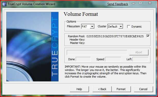Esto es donde usted elija si desea un archivo FAT o NTFS archivo. También puede establecer la opción de cluster, y si quieres que sea dinámico. Ahora, puede mover el ratón tan al azar como sea posible para "incrementar la fuerza criptográfica de su archivo". Sólo tonto.