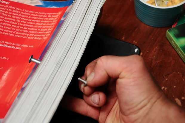 el libro se beneficiaría de tener un pice larga, delgada y rígida de metal a lo largo de los tres agujeros.
