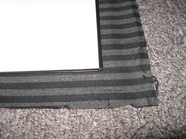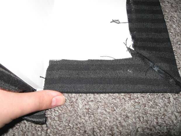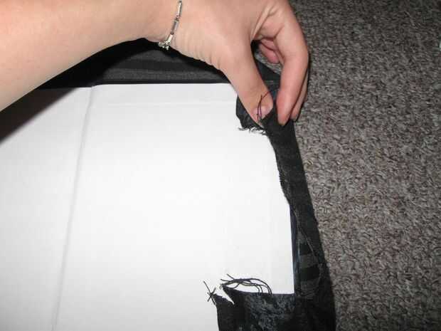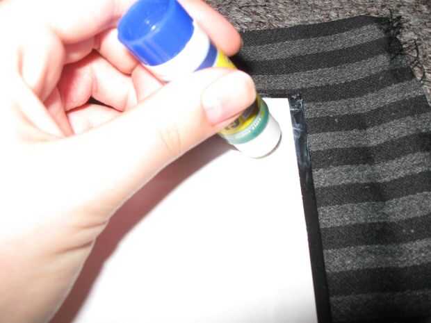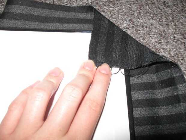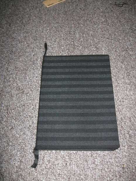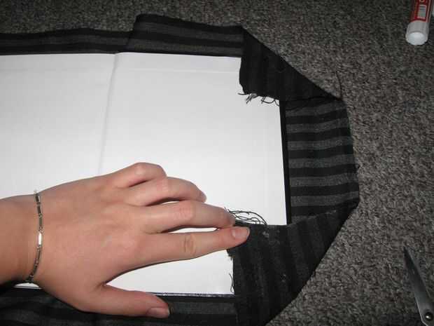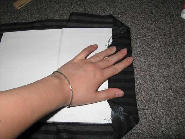 Ahora abre el Bloc de notas y pegar las esquinas. Doblar la esquina de la tela interior por lo que forma un poco cuadrada (ver tercera imagen). Hacer lo mismo con la otra esquina. Pegue el espacio vertical entre las dos esquinas (ponga un poco de pegamento sobre las esquinas demasiado). Doblar la tela y pegamento a la tapa. Ahora pega las partes horizontales. Repetir este proceso con la otra tapa y cierre el Bloc de notas por algún tiempo.