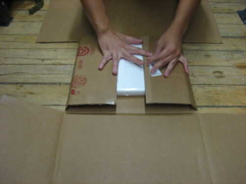 Coloque su ordenador portátil en la superficie de cartón, prestando atención a donde a hacer cortes y dobleces. Si tienes suerte, ya que estábamos, su caja ello será emparejado bien a su ordenador portátil. Aquí utilizamos una caja de envío de tamaño medio (aproximadamente 17 pulgadas de altura montados) y un ibook de Mac de 15 pulgadas.