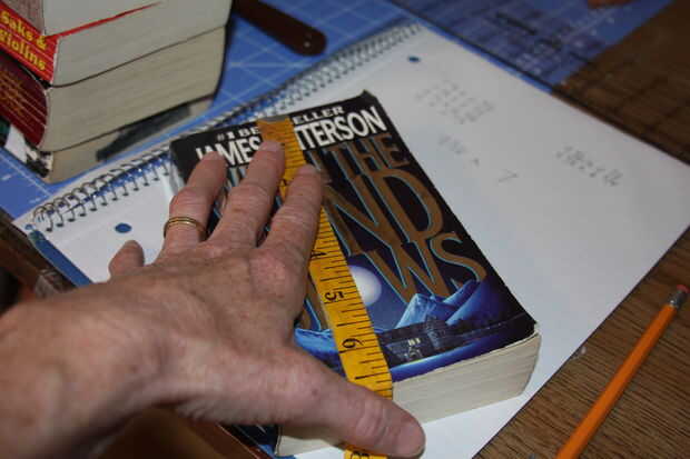 Medir libros y llegar a un tamaño medio. Me mide 6 libros de bolsillo que eran todos sobre todo el mismo tamaño-algunos más gruesos y algunos disolventes. Al medir, desea Asegúrese de que incluir la espina dorsal del libro; de lo contrario será demasiado pequeña! He utilizado una cinta métrica de costura, que es fácil de envolver el libro, pero también se puede utilizar una regla regular, medición del ancho de cubierta y ancho de la columna vertebral y sumando todas las tres medidas.