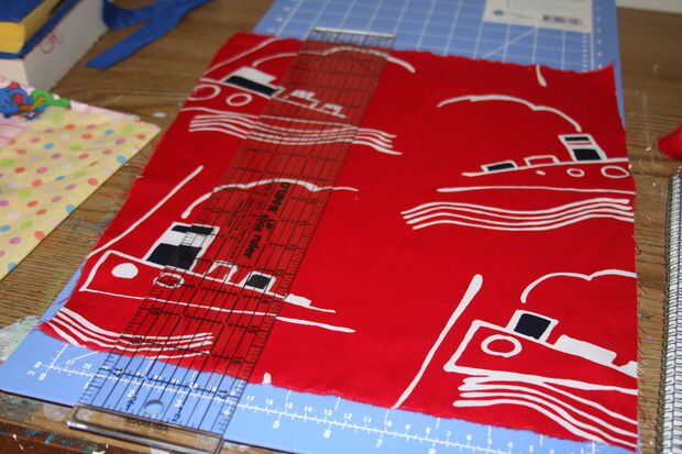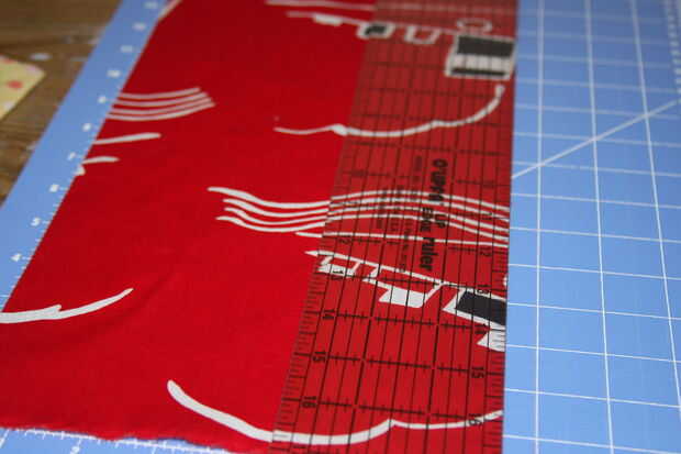 Cortar a la tela a medida. Usted necesitará hacer un borde recto a lo largo de al menos un lado. Quisiera rasgar el borde con tejidos como casi siempre termina como un borde recto. (Cortar un pequeño corte con tijeras y luego separe o desgarre en esta corte. Romperá a lo largo de un hilo tejido dándole un borde recto casi perfecto.) O puede utilizar su tijeras o cortador rotatorio para cortar un borde recto.