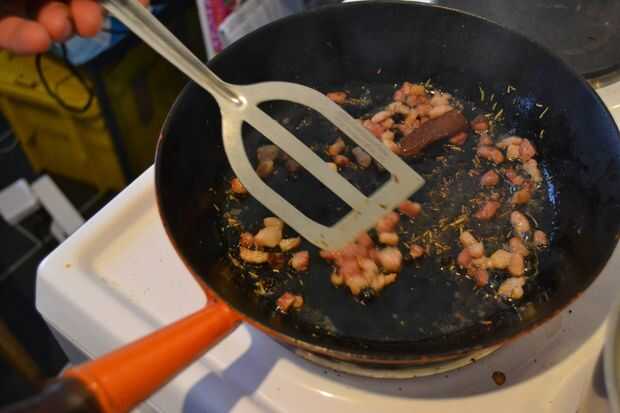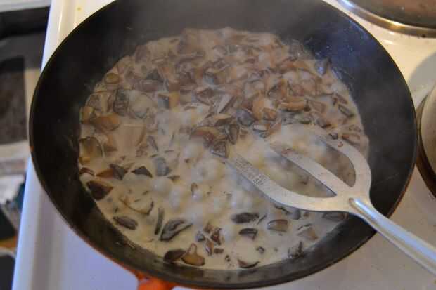 mientras tanto cortar dados la panceta o speck, aplastar algunas bayas de enebro y transferir a la bandeja que frito las crías de pulg. de filete el tocino por algunos minutos, luego agregue los boletes. después de algunos minutos de fritura desglasar con una copa de vino. Baje el calor, agregar la crema y si tienes, una cucharadita colmada de mermelada de arándanos rojos. Deje que el ragú a fuego lento durante 10 a 15 minutos, si se pone demasiado espeso añadir algo de agua. Sazonar con sal y pimienta.