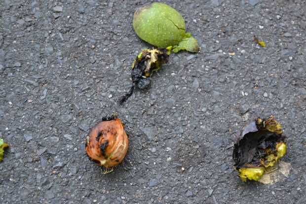 otra tuerca que se encuentra a menudo es la nuez. árboles de nogal son fácilmente reconocible por allí algo grande, hojas verdes brillante y las bolas verdes colgando en el árbol que las tuercas todavía están en la cáscara externa de allí. dentro de la cáscara verde, existe la cáscara dura, color marrón normal. la cáscara verde exterior desintegrates los años pasa y las nueces caen al suelo. que desintegrates da vuelta a marrón y fangoso y fácilmente puede manchar las manos y la ropa (que pueden utilizarse para morir y para hacer tinta!), así que tenga cuidado al recoger las nueces.