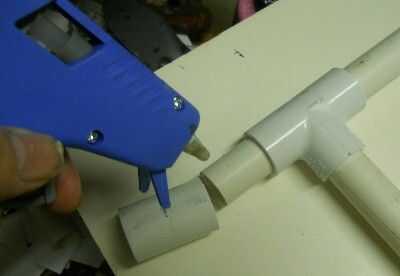 Todas las tuberías pueden pegan en la forma que se muestra en la imagen.  He utilizado pegamento caliente porque los tubos no tendrá que mantener la presión del agua.  Empujar tan lejos en las guarniciones como puedas antes de que el pegamento se refresca o se endurece.   Tenga cuidado porque el pegamento caliente es caliente!  He puesto un adaptador de empalme en cada extremo como una protección para mis ojos.  Sin el adaptador de empalme, el tubo puede ser áspero y fuerte así que no quiero hacer nada como eso cerca de mi ojo.  Así que no olvide de colocar en los extremos de la tubería como una protección extra para no rayar el ojo.