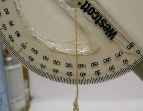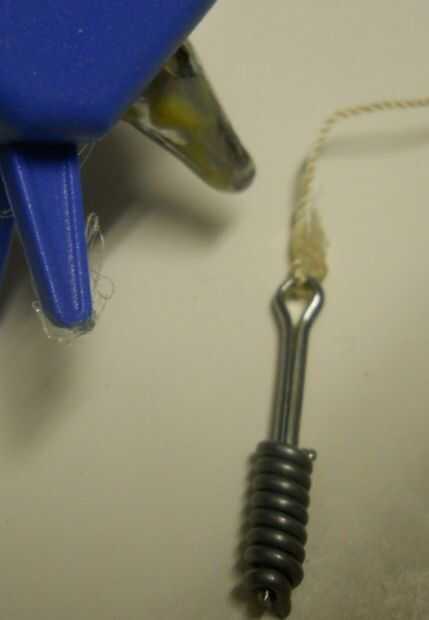 Ahora añadir la cadena a del transportador.  Necesitará taladrar un pequeño agujero en el punto de mira de los Goniómetros para pasar la cadena a través de.  Hice mi cuerda y péndulo de hilo de rosca grueso y un pasador.  Envolvió un poco de soldadura alrededor de la chaveta para darle un poco más de peso.  PODRÍA utilizar algún otro peso como una moneda u otro elemento, asegúrese de que no interfiera con las lecturas de la brújula.  Objetos de metal pueden ser magnéticos y a deshacerse de sus lecturas de la brújula.