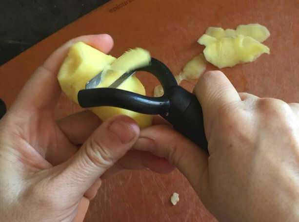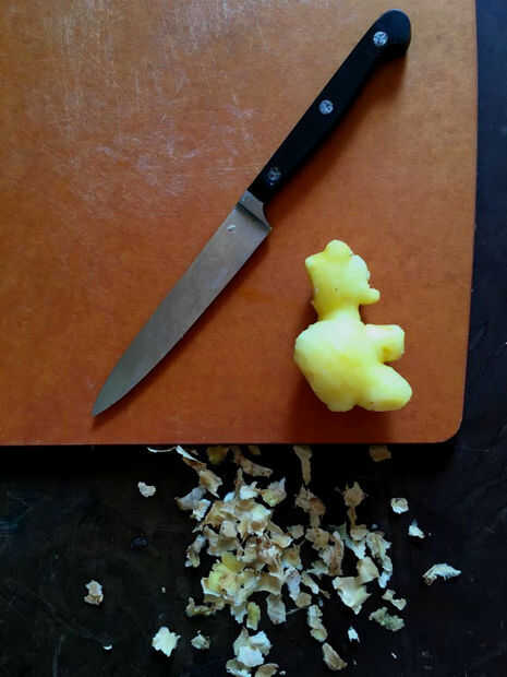 Pelar el jengibre fresco y rebanada tan fina como sea posible. Cortarlo longitudinalmente en vez de contra el grano. Puede utilizar un pelador de verduras para obtener rodajas finas de papel, aunque me pareció más fácil utilizar un cuchillo como el jengibre consiguió más pequeño. Ver los dedos y usar un cuchillo muy afilado. Será mucho más seguro utilizar. Una cuchilla desafilada requiere más presión para cortar. La mayor presión se necesita aplicar, mayor será el riesgo el cuchillo se deslice y rebane el trozo equivocado de carne...