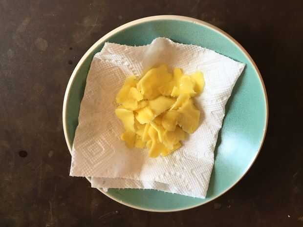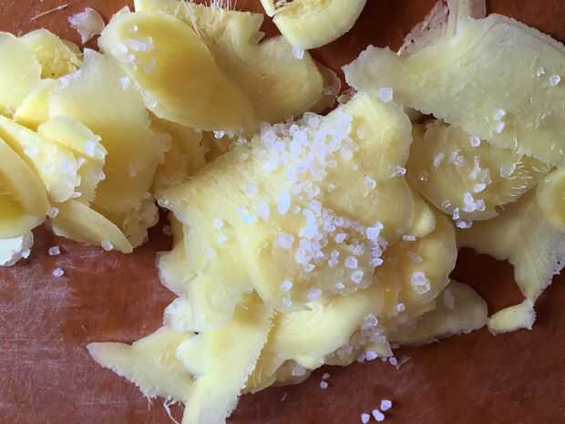 Esparcir sal gruesa sobre el jengibre en rodajas (enjuagar la sangre en primer lugar, si es necesario) y mezclar hasta que la sal se separa todo y sobre todo disuelto. Colocar en un bol y dejar reposar al menos una hora, o toda la noche en la nevera. Enjuague y pat que secar las rodajas.