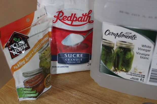 En una olla mediana mezcle el azúcar, vinagre, especias de conserva en vinagre y sal.