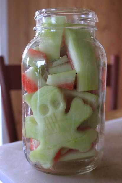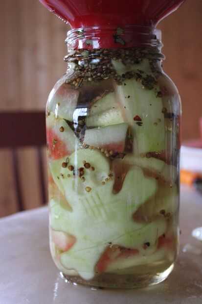 Vierta el líquido de conserva en vinagre caliente sobre la corteza, dejando una separación de 1/2 pulgada para el aire en la parte superior.