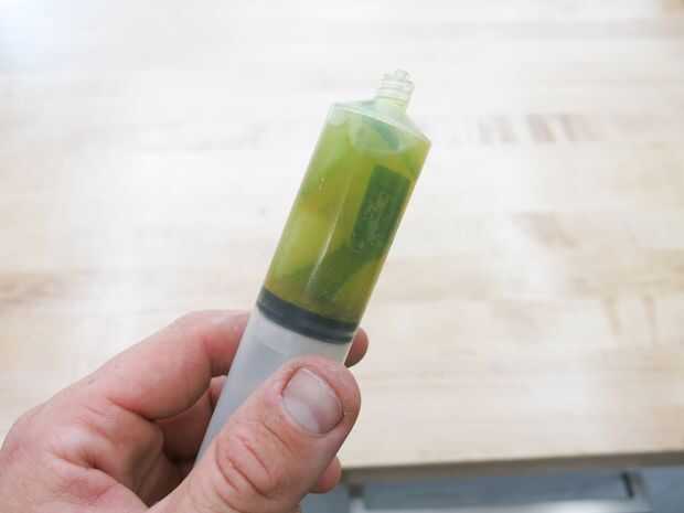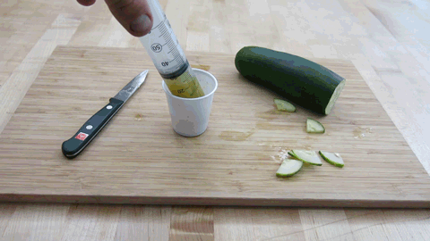 Con sus pepinos en la jeringa, tire de su salmuera para sumergirlos. Luego tapa la jeringa boca abajo y coloque el pulgar sobre la punta. Tire hacia atrás el émbolo para que se crea un vacío parcial dentro de y celebrar!