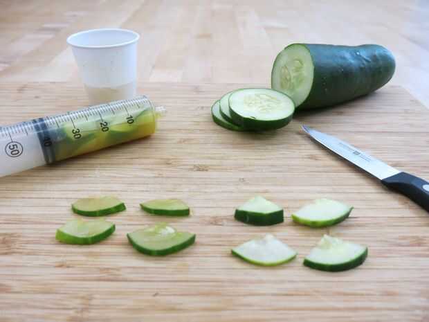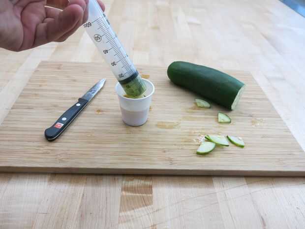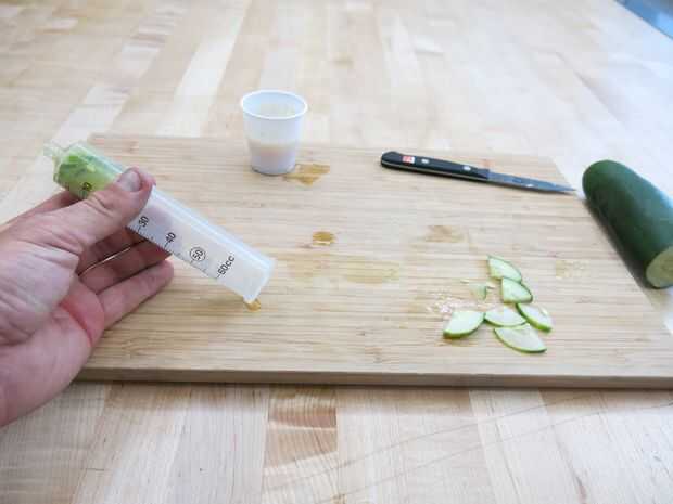 Empuje hacia fuera de la salmuera en la taza, quite el émbolo y derramar sus pepinillos! Puedes ver al lado de pepino ol ' regular y buscan GOOOOOOOD!